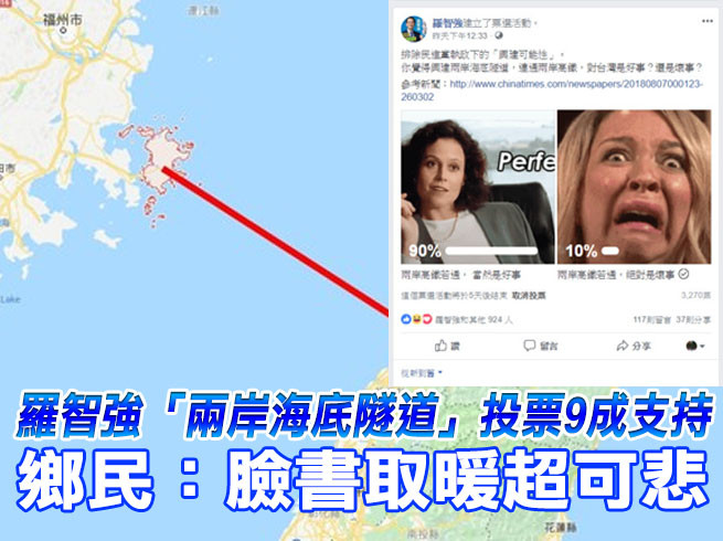 針對中國大陸單方面提出興建由福建省平潭至新竹的海底隧道,前總統府秘書長羅智強在臉書發起「興建兩岸海底隧道,連通兩岸高鐵,對台灣是好事還是壞事?」的投票,其中九成民眾認為是好事。