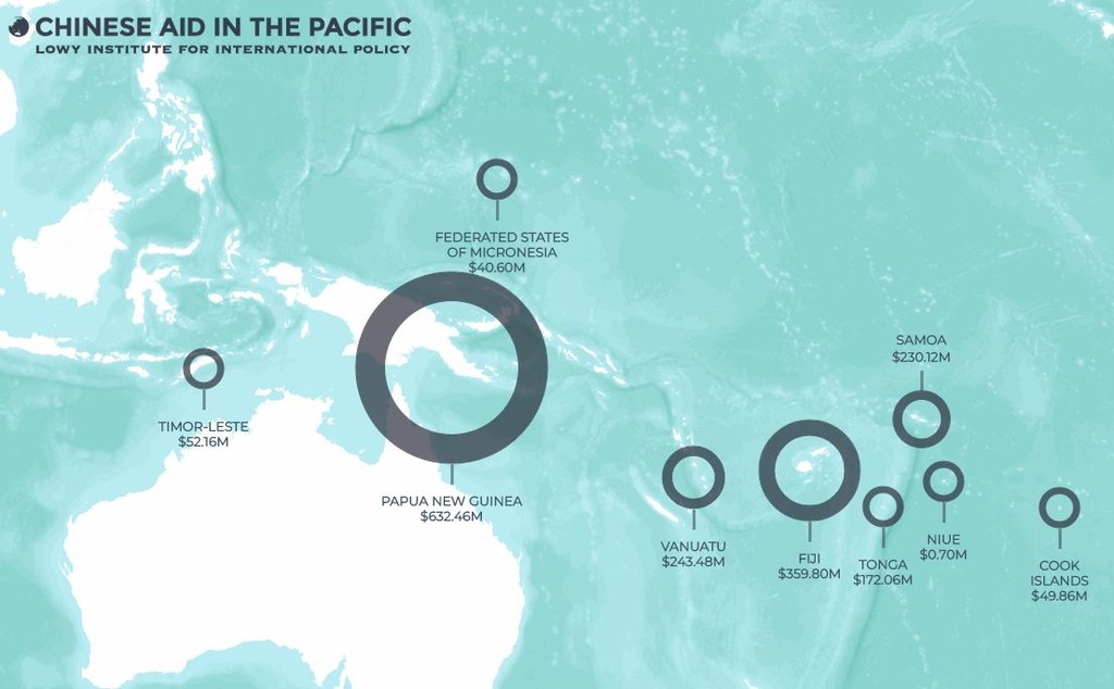 澳洲的外交政策智庫羅伊國際政策研究院(Lowy Institute for International Policy)近日公佈數據顯示,隨著中國捐助南太平洋的金額穩定增加,以及美國逐漸減少援助,截至2017年為止,中國已經成為南太平洋第二大捐助國,意味著北京在南太平洋的影響力逐漸追上澳洲、紐西蘭。