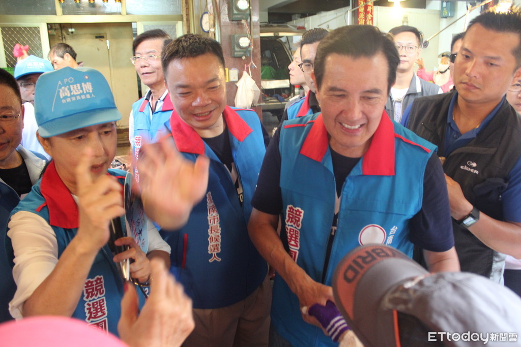 ▲前總統馬英九8月9日到台南市新營區,為國民黨市長參選人高思博輔選,與高思博及市議員蔡育輝前往第一公有零售市場拜票。(圖/高思博提供,下同)