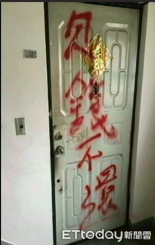 ▲施男因還不了錢而跑路,家中大門被噴紅漆「欠錢不還」 。(圖/記者陳玉翻攝)