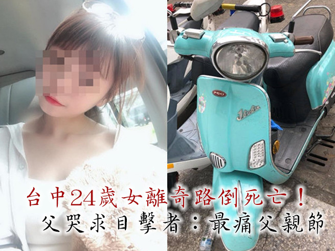 台中一名24歲黃姓女子8日騎車出門,不料中午12點多卻離奇倒臥大鵬路上,被發現送醫後傷重不治。家屬認為,案發的水湳經貿園區路段平整,車輛也不多,即便自摔應也不致送命,懷疑另有隱情。對此,黃父難過在臉書發文,表示「寶貝女兒別怕,老爸接妳回家了…」希望路過網友能提供行車紀錄器畫面,以還原真相。