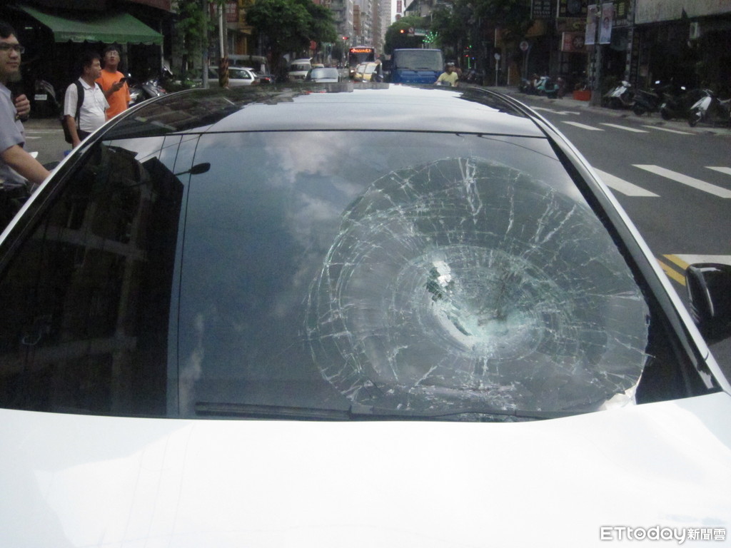 ▲詹姓婦人遭撞飛一層樓高,肇事的轎車擋風玻璃裂成蜘蛛網狀。(圖/記者林裕豐翻攝)