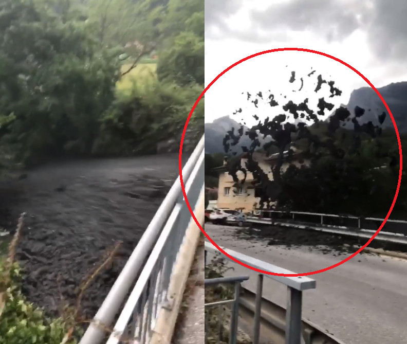 瑞士阿爾卑斯山的一個名為Grugnay的小村莊,在7日晚上因為一場暴雨,導致村莊遭受恐怖的「黑色土石流」侵襲。土石流從山上沖下,強烈的力量將橋墩撞壞,夾帶其中的土石更隨著一波一波的撞擊噴射而四處散落,就像火山爆發一樣,恐怖的景象被當地村民錄下,從影片中還能聽到旁人的尖叫聲。