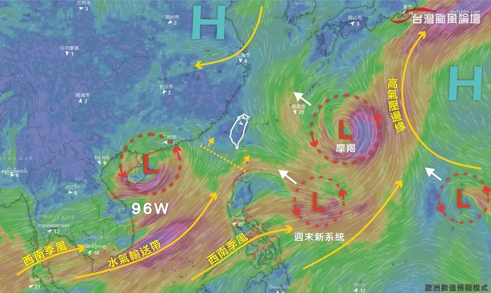 天氣粉專「台灣颱風論壇│天氣特急」表示,大低壓時代來臨,下周需留意強盛西南風,水氣輸送帶逐漸就位,96W滯留廣東沿海猶如幫浦,等待摩羯北上,將帶動第一波西南風水氣。