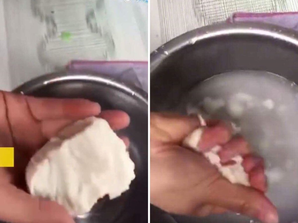 該女回家後,因好奇將饅頭放在水中浸泡,最初並沒有鬆散,還可以捏出水來,她邊捏饅頭邊說「全是衛生紙」,還把整個過程拍攝上傳,引發各界關注。
