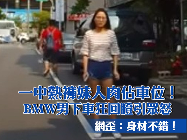 林先生10日開車到台中市一中商圈附近拜訪客戶,車子開到育才北街發現有一個公有停車格,正要靠近停進格子時,一位穿熱褲的年輕女子卻「人肉佔車位」,過沒多久一輛黑色BMW急速插進林先生前停進車位,讓他氣得直呼「現在還有人這樣人肉佔車位的喔?」
