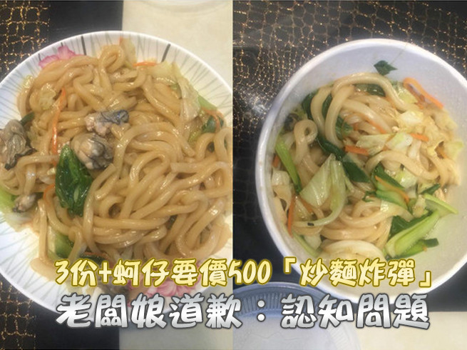 台中一名林姓男子10日到一家海產店外帶3份「蚵仔炒麵」,沒想到結帳時卻被老闆娘收了500元,懷疑自己遭到店家惡意坑殺,憤而上網PO文抱怨,引起網友熱烈討論;不過賣出超貴炒麵的老闆娘也有話要說,她坦言店內並沒有「蚵仔炒麵」的選項,因此當天是將要價260元的清炒鮮蚵加入炒麵中,算起來剛好是500元沒錯,「我們在溝通上認知有問題,確實對客人比較抱歉!」