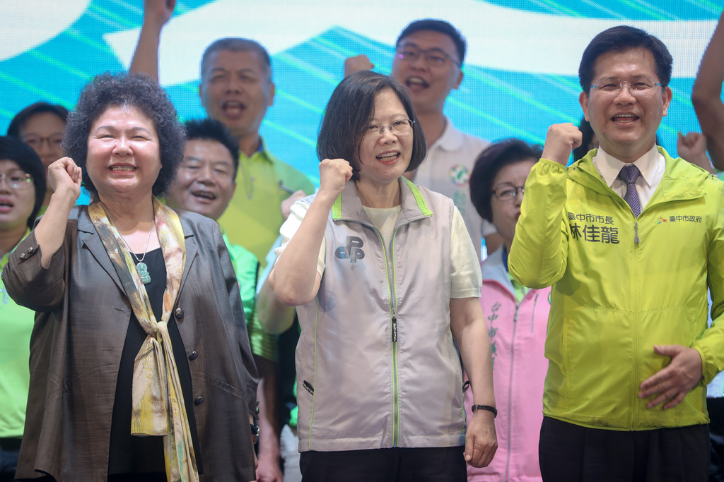 ▲總統蔡英文替台中市長林佳龍授旗。(圖/民進黨提供)
