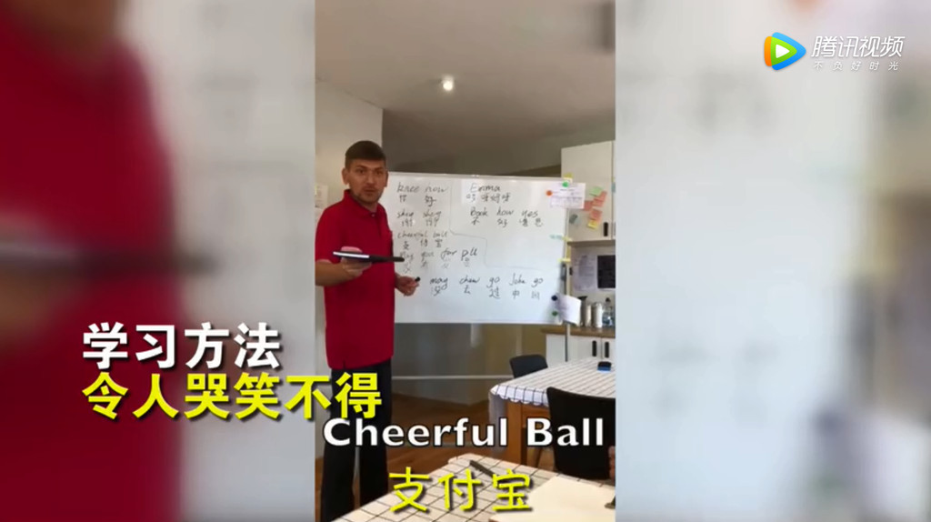 店員在影片裡說,「現在是早上6點,趁我們有空的時候,我們的經理竟然跑來教中文!」鏡頭轉向一個教學白板,經理以英文口音念出「ㄕㄟ~ㄕㄟ~(謝謝)」,掌鏡的店員還被經理點名,「史帝夫,跟我念,Cheerful Ball(支付寶音譯)」,店員只好乖乖跟著複誦Cheerful Ball。