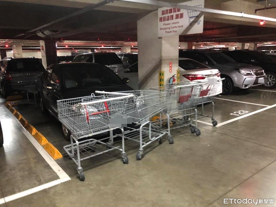 照片中可以看到,該輛汽車直接停放在購物車的放置區,上方也有一塊板子寫著「請將購物車推回這裡,謝謝」;亂停的黑車前方放置了4台推車,緊接著車子的前方,團團包圍,看來要出去得花費一點功夫。