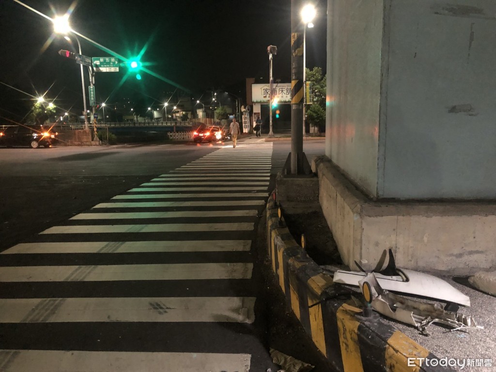 ▲新北市泰山區發生一起死亡車禍,遭撞的機車全毀。(圖/記者趙永博攝)