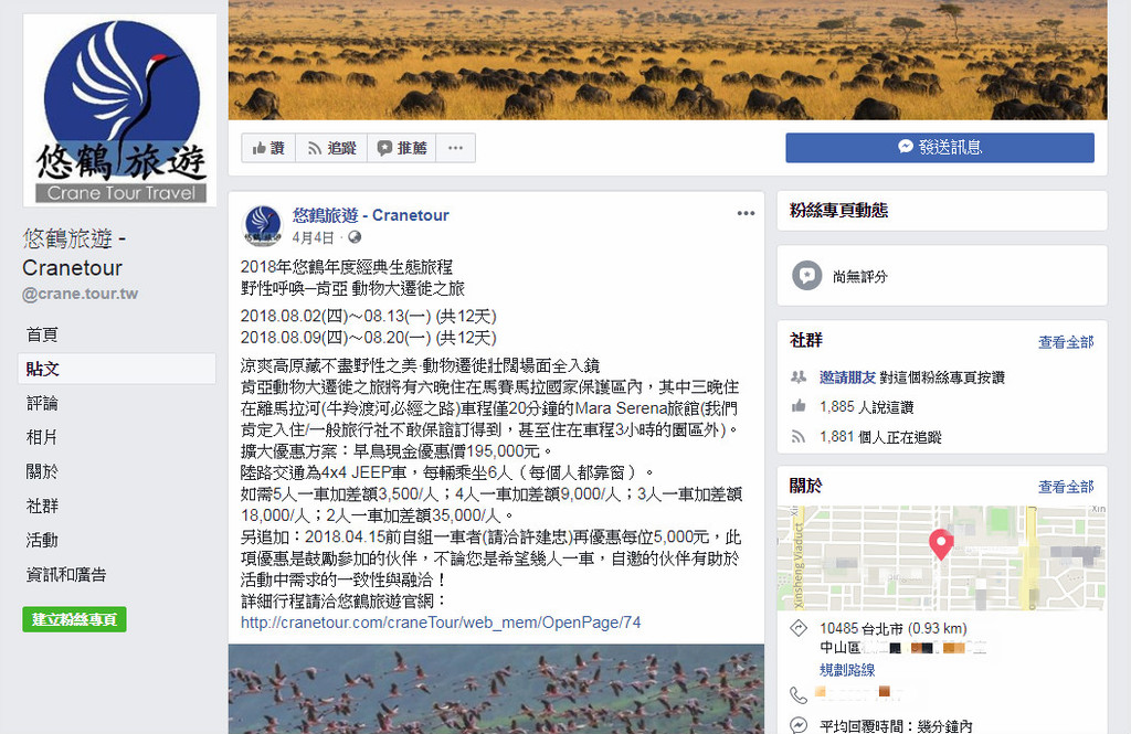 鶴悠旅行社(粉絲專頁名稱為悠鶴旅遊)今年4月在臉書貼出肯亞旅行團行程,開了兩團12天的「2018年悠鶴年度經典生態旅程 野性呼喚─肯亞 動物大遷徙之旅」,分別會到奈洛比、波格里亞湖區、埃爾門泰塔湖區、馬賽馬拉國家保護區、奈瓦沙湖(Lake Naivasha)等地。