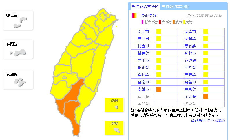 大雨特報:台北市、新北市、桃園市、新竹市、新竹縣、苗栗縣、台中市、彰化縣、南投縣、雲林縣、嘉義市、嘉義縣、台南市、台東縣、花蓮縣、宜蘭縣、基隆市