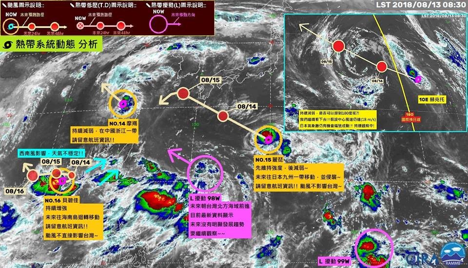今年颱風特別多,8月不到一周就有3個颱風誕生,中央氣象局也分析目前熱帶系統的最新發展。今年第14號颱風摩羯今(13)日下午2時已減弱成熱帶性低氣壓,15號颱風麗琵後天預計接近日本九州附近,16號颱風貝碧佳則持續在廣東海面徘迴。值得注意的是,周四、周五還有一個新熱帶擾動可能會接近台灣,另有一個中太平洋颶風「赫克特」也有機會跨過換日線成第17號颱風。