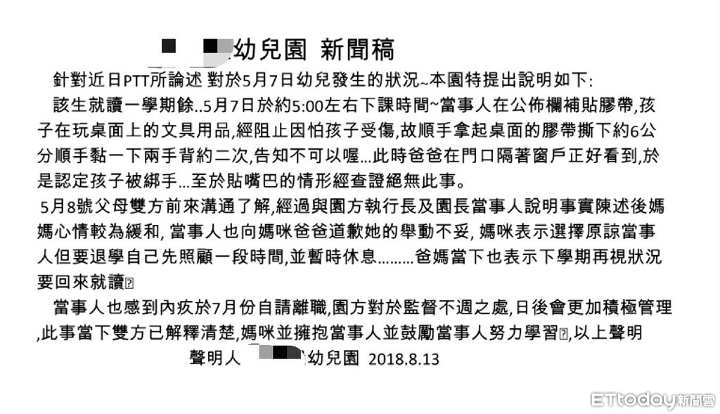 台南私立幼兒園傳3歲幼童遭黏膠帶,12日晚間家長在PTT貼出「小心!我小孩上幼兒園居然被黏膠帶」指稱回家問出男童就學期間遭老師用膠帶封口及繞手綑綁,嚇得家長留職停薪自己帶小孩,鄉民踴躍留言,園方表示,3個月前老師與家長早已相擁而泣的和解,並退回註冊費、月費,該名老師7月間愧疚離職後進修,有待教育局稽查釐清。