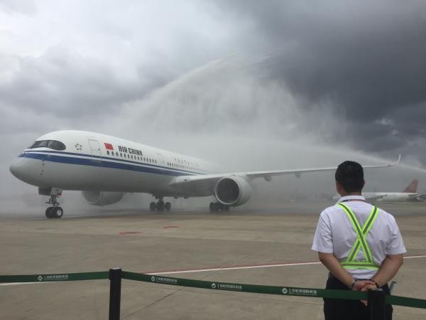 中國國際航空公司全新引進的空客A350-900,成功在14日完成首次飛航。國航CA1557航班順利從北京飛往上海虹橋國際機場,機上載了300多名乘客,一抵達目的地就以水門儀式歡迎。