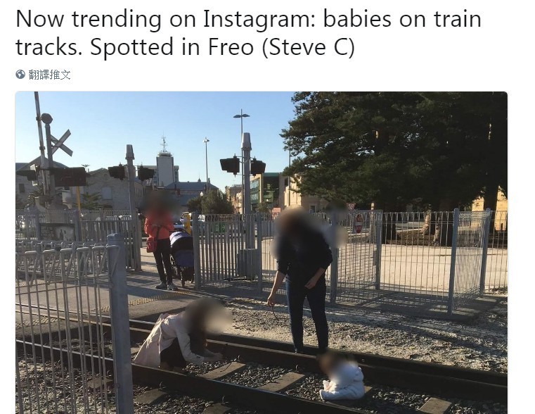 澳洲西澳弗里曼特爾市(Fremantle)一名媽媽為了自拍,竟然將嬰兒獨自放在鐵軌上,她則是在距離1公尺遠處拍照,危險的景象被人分享到網路上後,令許多人感到震驚,紛紛怒罵「太危險了」、「有夠蠢」,在網路上引起討論。