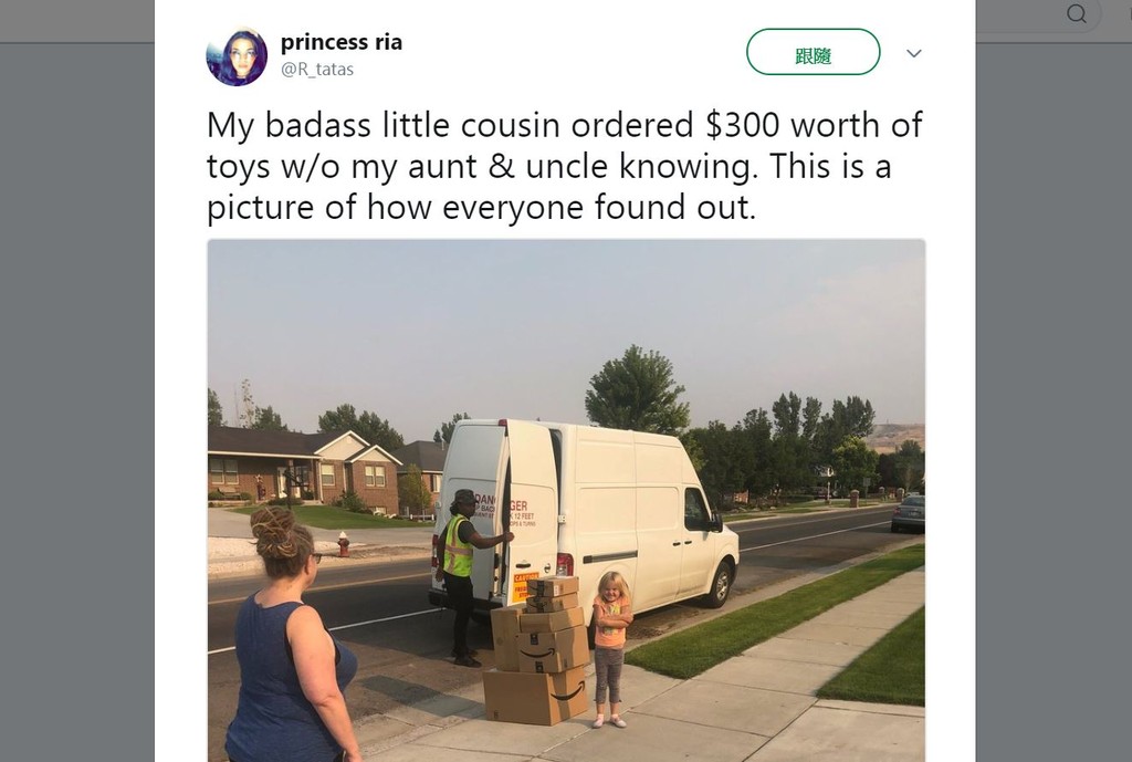 凱特琳的表姊瑞亞‧狄耶露(Ria Diyaolu)11日在twitter上發佈壞蛋表妹的誇張行徑,短短幾天就獲得7萬多網友按讚、轉推。狄耶露寫道,她很驚訝一個6歲女童竟然知道怎麼直接下單,還會選擇隔天出貨,就連阿姨和叔叔都不知情。
