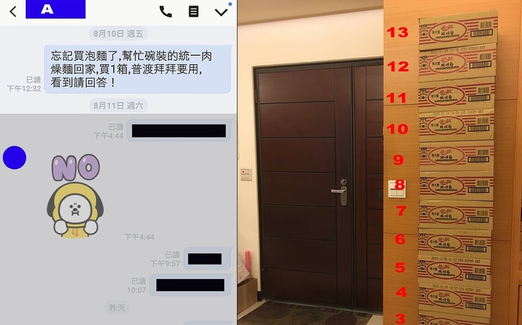 這時,眾人回頭檢視Line對話,才發現媽媽傳給C的訊息,原本要輸入「1」,卻不小心打成了「11」,再加上A跟B各買1箱,造就了不可挽回的盛況,泡麵一箱箱往上堆疊起來,13層樓儼然成為新地標,「明明複製貼上可以的東西,會被我媽打成11箱阿阿阿?」
