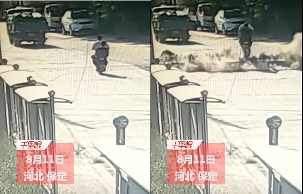 中國大陸河北保定市一名騎士,日前騎車行經蠡縣南沙口村一處路段時,地面突然炸裂,導致他與後方所載的乘客雙雙落地,幸好2人都沒有大礙。