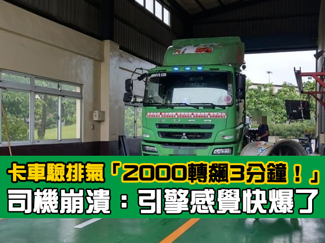 卡車司機在臉書PO文表示,自己把車子開去驗車場檢查排氣,「檢測人員維持2000轉以上,持續快3分鐘,而且還2次!」引擎聲、輪胎聲傳來讓他心如刀割,直言說「我開車都1400轉左右換檔,若在最高檔位、最高速度時,轉速都不會超過1500轉……。」