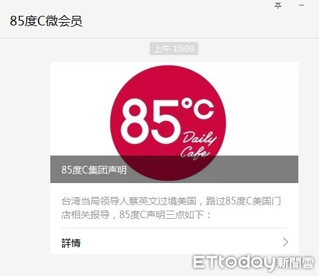 三、報導稱85度C對一行來訪客人送出訂製大禮包並非實情,美國店鋪員工來自四面八方不同國籍,有一名員工臨時拿出店內吉祥物巴布蘿麵包抱枕給台灣當局領導人簽名留作私人紀念,並非報導說的店鋪準備事先訂製的大禮包。85度C重申支持九二共識推動兩岸和平,並期待華人品牌在國際發光發亮。