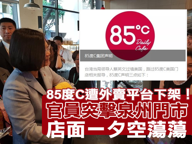 總統蔡英文出訪時過境美國洛杉磯,路過當地85度C門市,引發大陸網友群情激憤,痛批85度C是「台獨企業」。事後,85度C雖緊急發出聲明,強調支持九二共識、兩岸一家親,但網友仍揚言抵制,還傳出多個App外賣平台將85度C下架。隨著風波越演越烈,泉州市市場監督管理局15日也開出第一槍,以「例行檢查」為由,突擊了85度C位在福建泉州的門市。