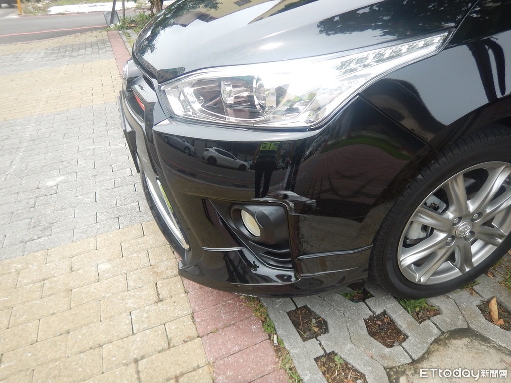 ▲汽車前保險桿與阿婆的機車撞擊後,出現刮痕。(圖/記者李忠憲翻攝)