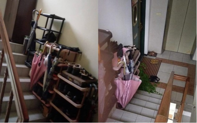 簡直把公共區域當成自己家!日前一名女網友在臉書「爆怨公社」po出一張圖,照片上的樓梯竟被層層堆滿了鞋架、雨具等雜物,硬生生將整條走道縮減成一半,僅剩下狹窄的空間可以行走。