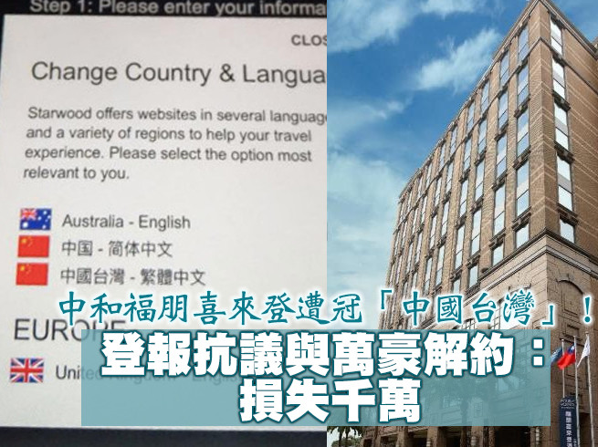 台北中和福朋喜來登酒店不滿在SPG訂房網站上被冠名「中國台灣」,不僅提出嚴正抗議,與萬豪酒店集團解除合作合約,還登報發聲明,表示即刻起拒絕任何SPG訂房系統的新預約。酒店總經理表示,公司還在評估解約造成的損失,目前初步算起來應該超過千萬,但高層認為台灣的尊嚴更重要。