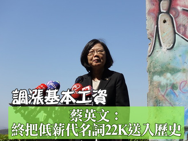 「22K即將走入歷史。」正要離開巴拉圭前往貝里斯的蔡英文表示,看到訊息,基本工資審議委員會共同決議,明年1月1日開始,每個月的基本工資,將調漲為23,100元,增加1,100元,調幅為5%。時薪制的資本工資也從140元調漲為150元,調幅為7.14%。