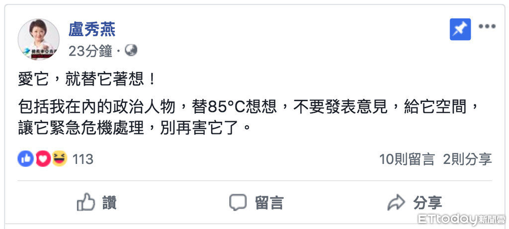 「愛它,就替它著想!」台中市長參選人盧秀燕16日晚間9點透過臉書表示,「包括我在內的政治人物,替85度C想想,不要發表意見,給它空間,讓它緊急危機處理,別再害它了。」