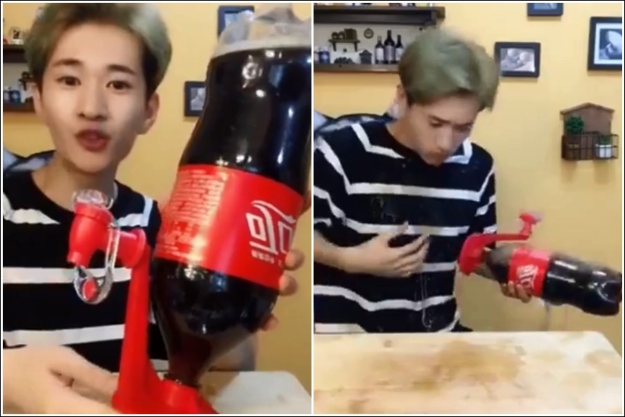 網友上傳影片至臉書社團「爆笑公社」,透過畫面可以看到,一名男子買了「倒置飲水器」,裝在飲料瓶口上,他原本以為只要按下開關,就能像飲水機一樣,很方便直接喝著可樂。沒想到當他把水龍頭放在嘴上,一開啟開關,可樂竟然直接噴爆出來,飲料都灑滿了他的全身,看起來相當狼狽。
