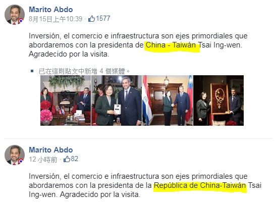 ▲ 巴拉圭總統臉書更正「中華民國台灣」。(圖/翻攝Marito Abdo臉書)