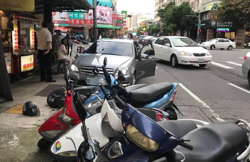 照片中,一輛銀灰色的賓士車停在路邊,前方一整排機車像骨牌一樣橫倒,險些就直接撞進一旁的攤販;而從另一個角度來看,賓士車的右側剛好就是車輪餅攤販的看板,可愛的畫風反而與車禍現場形成強烈對比。