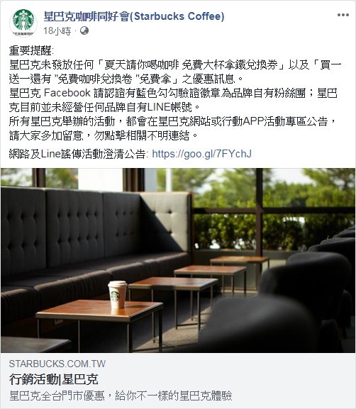 文中強調「所有星巴克舉行之行銷活動,均會於星巴克網站或行動APP活動專區中公告,請消費者多加留意以免受混淆。」該文同時附上多張「假優惠活動」提供顧客參考對照。