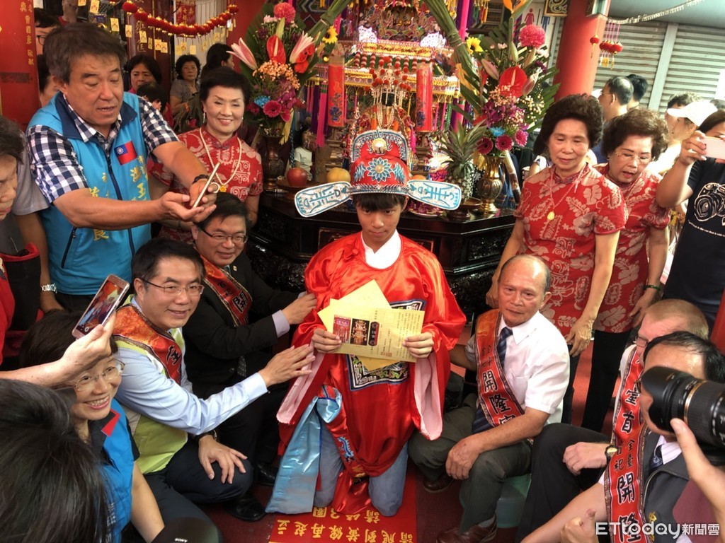 ▲台南市長參選人黃偉哲前往台南安平開台天后宮參與「做16歲」成年禮科儀活動。
