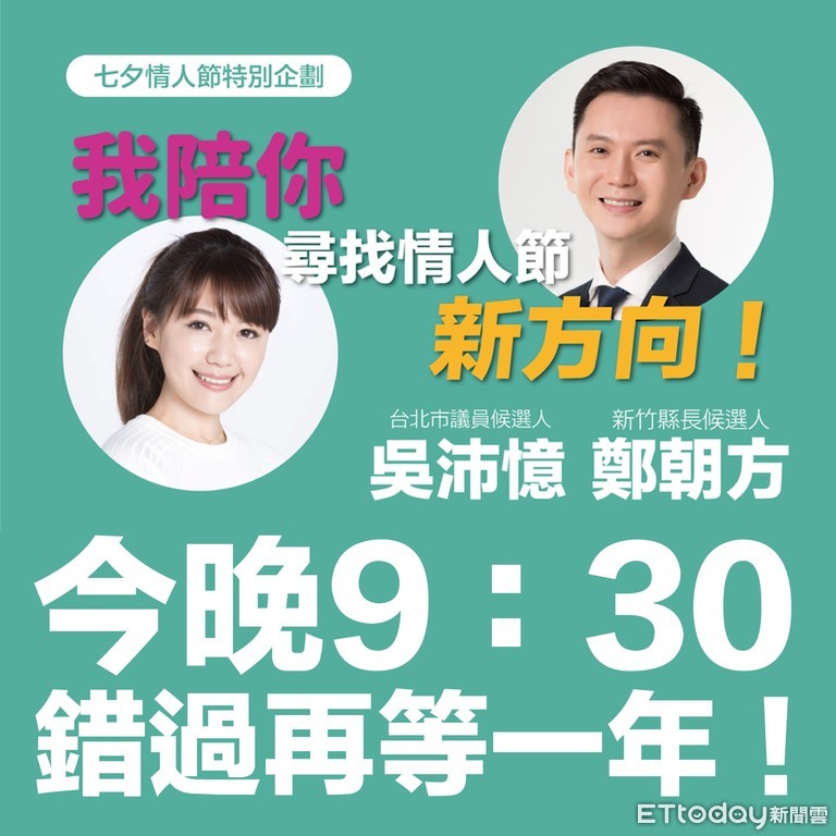 七夕情人節,兩位單身的新竹縣長候選人都選在情人節與民眾一起度過。民國黨參選人徐欣瑩與台北市長柯文哲推出了「徐欣瑩+柯文哲 七夕特輯的Q&A」,兩人大談心目中的情人典型,以及情人節都怎麼安排。民進黨參選人鄭朝方將在今晚9點半與台北市議員吳沛憶一起臉書直撥,和網友一起過一個不一樣的情人節。