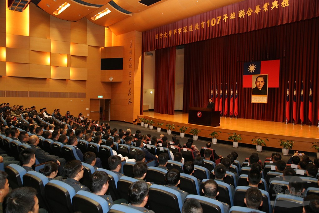 畢業典禮上午在國防大學率真校區舉行,嚴部長在典禮前先接見友邦駐華大使及受訓人員,隨後主持畢業典禮,賀勉今年軍事深造教育畢業學員,並頒發結訓證書、頒獎表揚績優學員,同時授予友邦受訓人員軍種獎章。