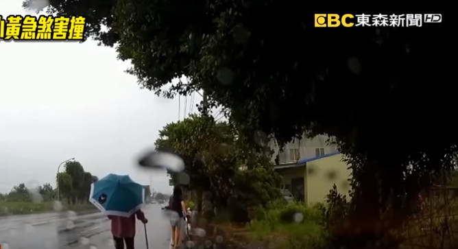 從監視畫面可以看到,少女牽著一輛腳踏車在路邊樹下躲雨,接著舉起半手但沒幾秒又放下來,此時一輛計程車經過,似乎以為少女要攔車,因此緊急剎車並切到右方,導致後方女騎士來不及反應撞上,連人帶車當場噴滑出去。少女聽見巨響還頻頻回頭張望事故現場,不久一名撐傘的老婆婆步行出現與她會合。