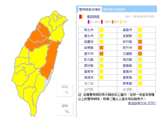 繼14時45分將花蓮升級為豪雨特報後,氣象局在15時25分再將新竹、苗栗、台中升級為豪雨特報。氣象局指出,新竹、苗栗、台中及花蓮地區有局部大雨或豪雨發生的機率,宜蘭、西半部其他地區及台東山區有局部大雨發生機率,請注意雷擊、強陣風及溪水暴漲。