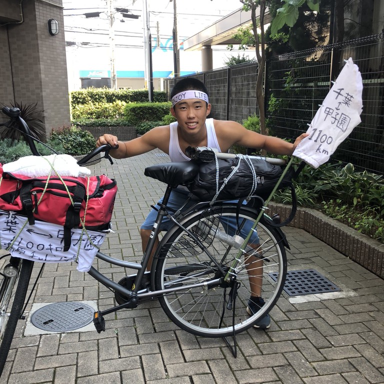 他在10日上午騎著平常上下學通勤用的淑女車,載著帳篷和行李,從船橋市的家中出發;還從制服上剪下一塊布料,寫上「千葉←→甲子園1100km」,插在腳踏車上當作旗子,並將照片上傳到推特上,短短幾天內就累積近5.6萬人按讚、1.3萬人轉推。