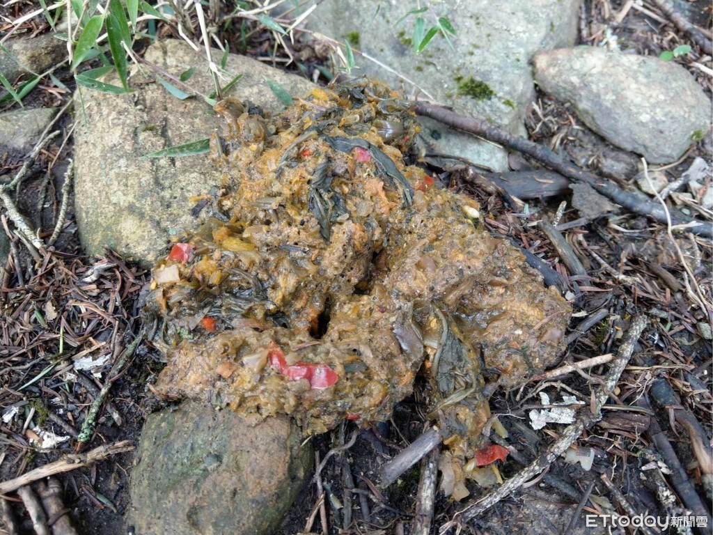 ▲山友發現1隻台灣黑熊進入嘉明湖山屋旁倉庫尋找食物並在吃完後離開,台東林管處人員沿著黑熊出沒路徑,發現食物包裝及黑熊排遺。(圖/台東林管處提供,下同)