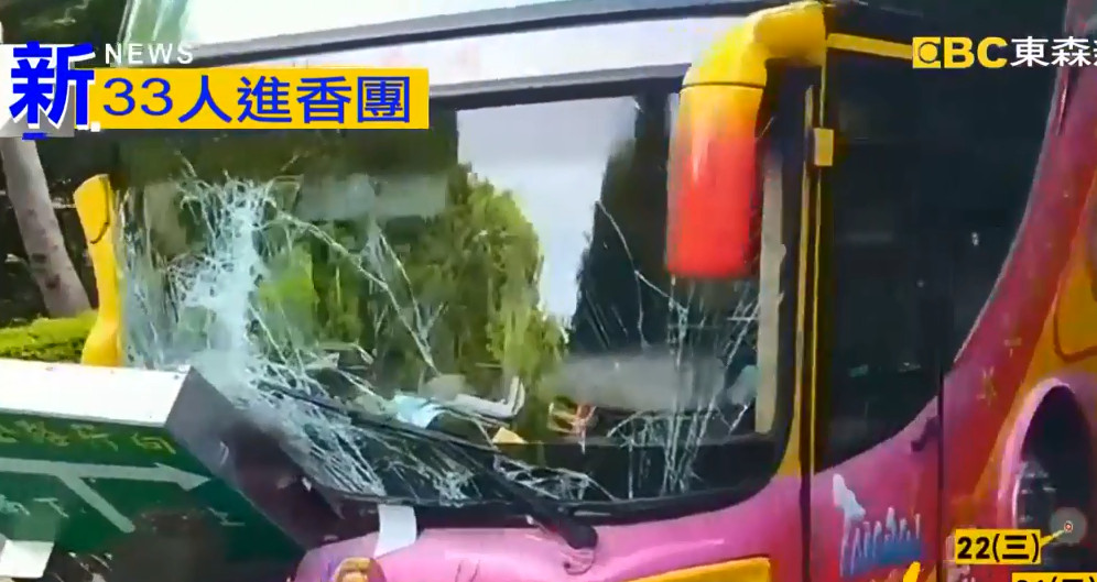 新北市一輛遊覽車19日從樹林出發,前往苗栗縣三義鄉九華山道場參拜,未料清晨6時40分抵達大門停車場時,竟撞上分流通道的護欄,造成8人受傷、遊覽車車頭嚴重毀損。