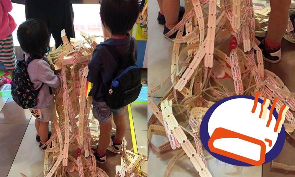 女網友表示「這兩個小孩是湯姆熊全場焦點」,並貼出一張照片,只見兩個小孩站在湯姆熊的換獎櫃台前,年紀看起來頂多幼稚園和國小生,兩人都揹著後背包,一人捧一大把的彩券,數量多到像是玩拉霸機中頭獎的感覺。