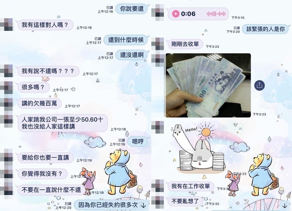 她說,念在曾是男女友的份上,一直給前男友機會,希望對方盡早還錢,但「每次他答應卻不斷推拖不還,一直拖,從6月分手至今一直沒收到錢,連一毛錢的都沒拿到!」