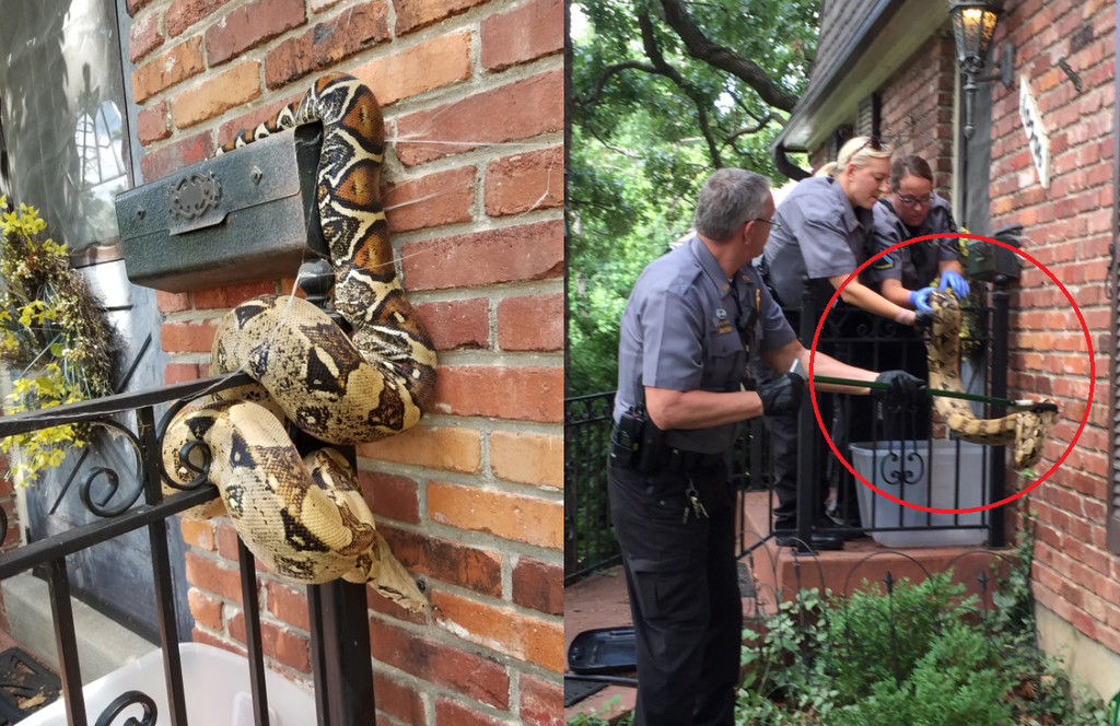 ▲紅尾蚺把郵筒蓋住。(圖/翻攝自推特/Overland Park Police)