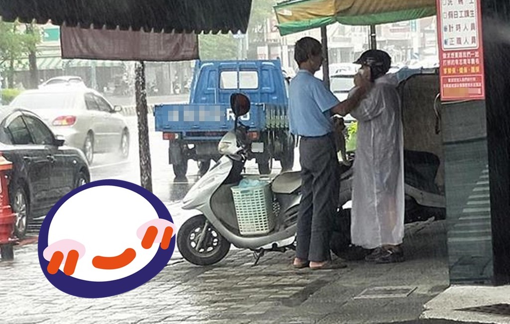 該名網友在臉書《爆廢公社》表示,「台南的路上看到,老夫老妻的感情好甜蜜,因為突然下雨,又只有一件雨衣,所以給老伴穿」。只見一對夫妻正在店家前的遮雨棚下穿雨衣,但只有老婆穿著半透明的粉色雨衣,老翁則是正在替妻子繫好安全帽。
