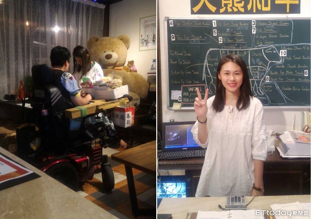 從網友吳秉和在臉書「爆廢公社」PO出多張照片可見,一名坐著電動輪椅的男子隱藏在餐廳角落,雙手放在木製桌上,頭卻是微微低著,顯得極為落寞。一名長髮女子則是站在一旁,頭也微微往下看,似乎正在忙碌著什麼。