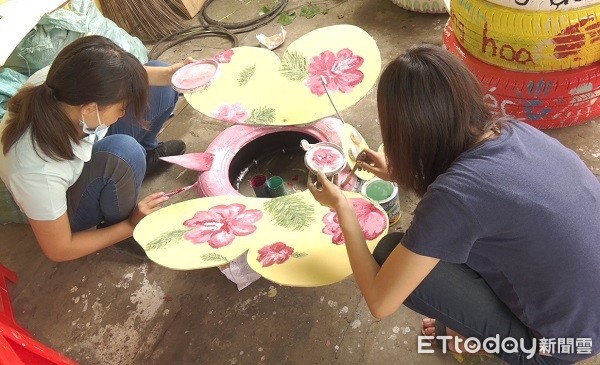 ▲ 志工團隊帶領小朋友們將回收廢棄輪胎巧用構思美化當地社區周邊環境。(圖/中央大學提供)